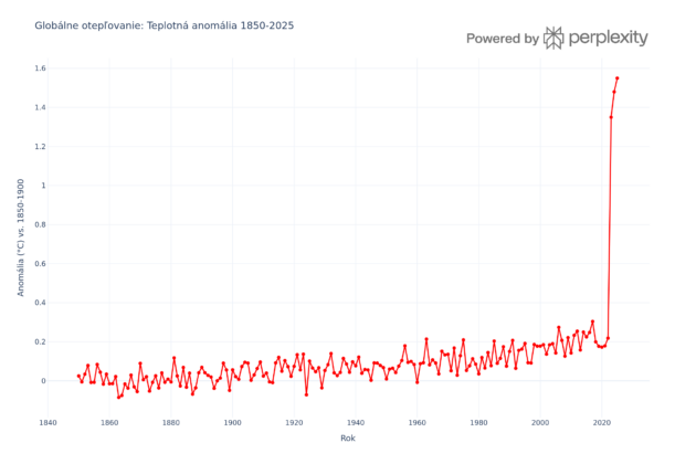 Graf teplotných anomálií od 1850 do 2025 jasne ilustruje zrýchľujúci trend otepľovania, s hodnotami prekročenými +1,5 °C v posledných rokoch. Dáta potvrdzujú, že bez ambicióznejších opatrení parížske ciele ohrožujú rast emisií.